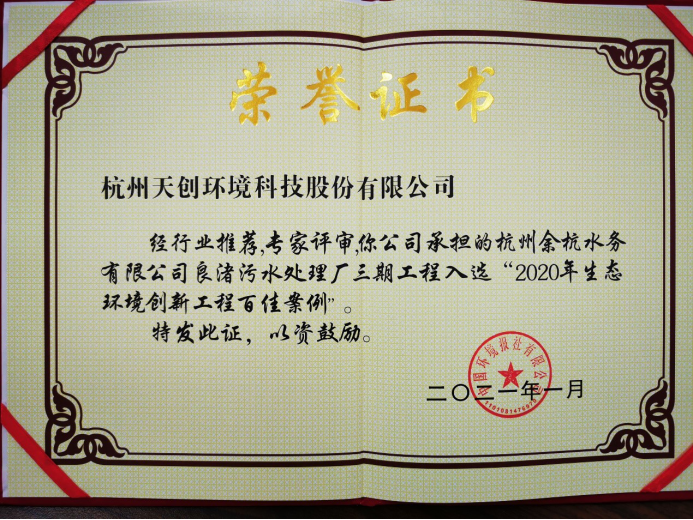 2021年伊始,由国家生态环境部主管、中国环境报社主办的“2020年生态环境创新工程百佳案例”入选名单发布。杭州天创环境科技股份有限公司建设与运营的“浙江省杭州市良渚污水处理厂三期工程”成功入选全国百佳工程案例。