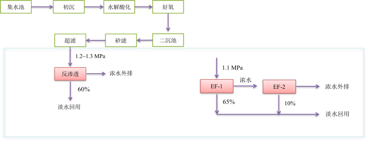 杭州易膜环保则根据中水回用需求,针对性开发两款节能膜产品EF-1、EF-2,替代常规的反渗透膜组件。我国是纺织印染大国,每年约有6~7亿吨印染废水排入水环境中,占整个工业废水排放量的35%,因此我公司选用印染废水作为回用试验进水,在回用流程基础上,使用EF-1替代原先的反渗透膜组件,有效降低运行压力至1.1 MPa、提升系统回收率至65%;同时,将EF-1浓水侧直接与EF-2膜组件相连,利用EF-1膜组件系统浓水残留的驱动力,进一步获得10%的产水,即将整体系统废水排放率由初始的40%减少为25%。由于该工艺只增加了EF-2膜组件系统,免除中间水箱、增压泵及高压泵等辅助设备,所需投资成本有限。
