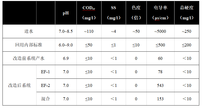 更换为节能膜后的回用系统产水水质数据列于下表中,数据表明反渗透膜组件更换成EF-1膜组件及加装EF-2膜组件后,虽然系统运行压力降低、系统回收率升高,混合产水的电导率有所升高,但仍符合回用标准。综合运行时的电费、化学清洗费、膜元件折旧费等对吨水处理费用进行估算,发现使用EF-1及EF-2膜组件后,吨水处理费用降低20%以上,表明节能膜在印染废水甚至其他工业废水回用方面具有一定的应用前景。