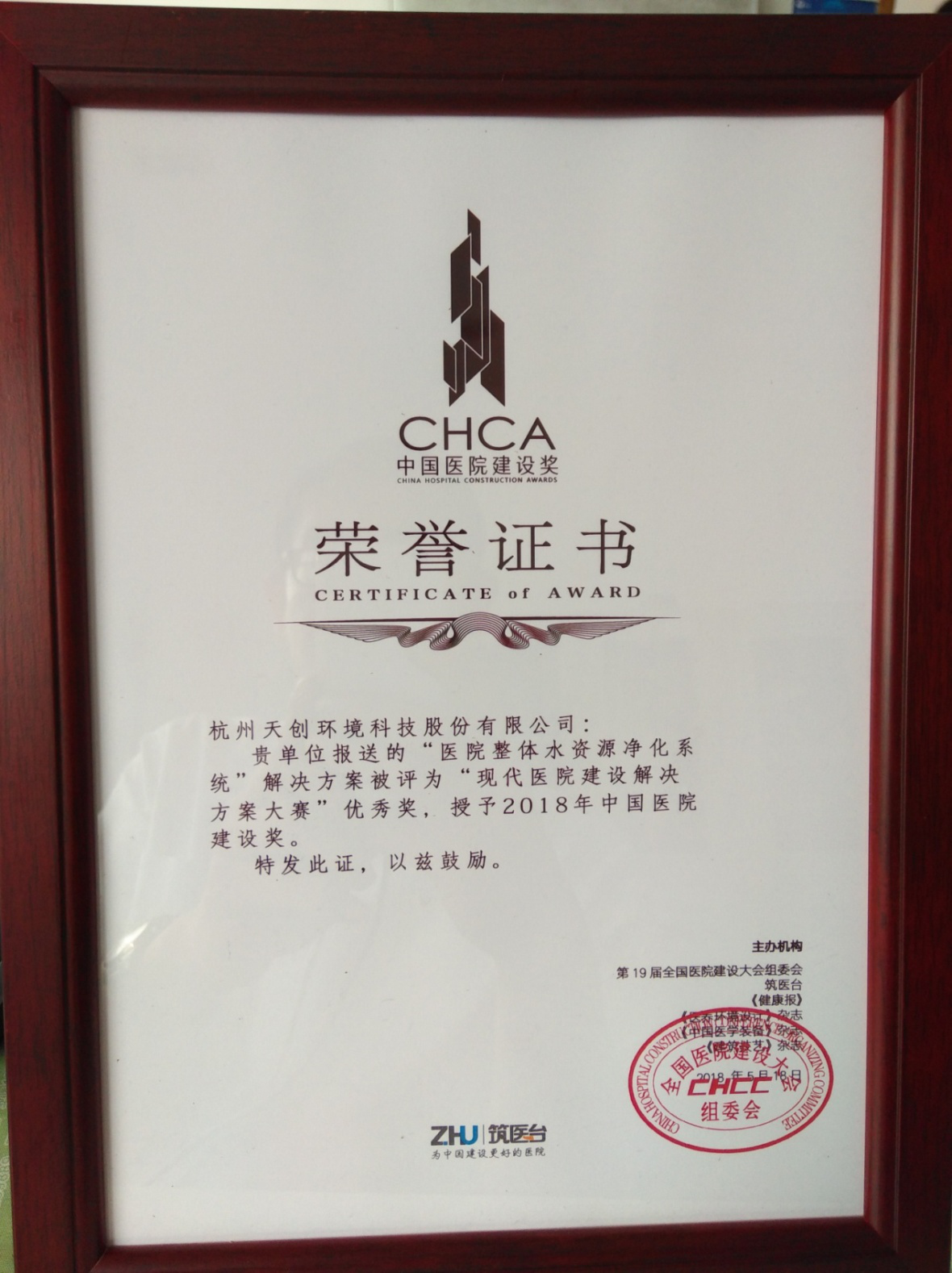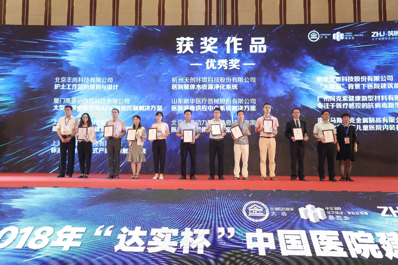 同期举行的2018年中国医院建设奖,素有医院建设风向标之称。作为行业权威评选系列评选活动,自启动以来,获得了行业及社会的高度关注和热情参与!经过微信公众号投票,以及专业评委打分等环节层层选拔,杭州天创环境科技股份有限公司在凭借“医院整体水资源净化系统”解决方案获得了由大会组委会授予的“现代医院建设解决方案大赛”优秀奖。